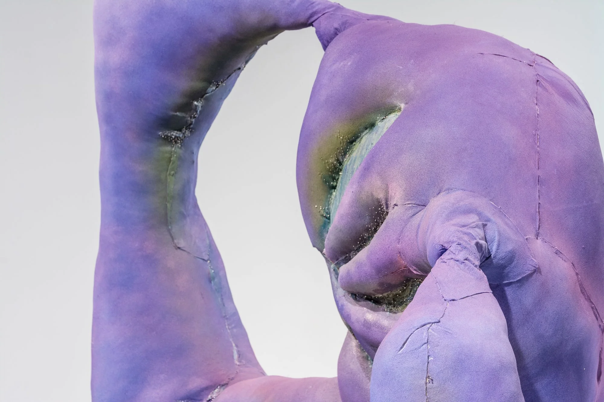 Exterior: stretched fibers, stuffing, resin-coated paper liners, pins, glitter, hot glue, string, and acrylic paint. Interior: wood, knotted fibers, and plaster gauze. 65x36x74 inches