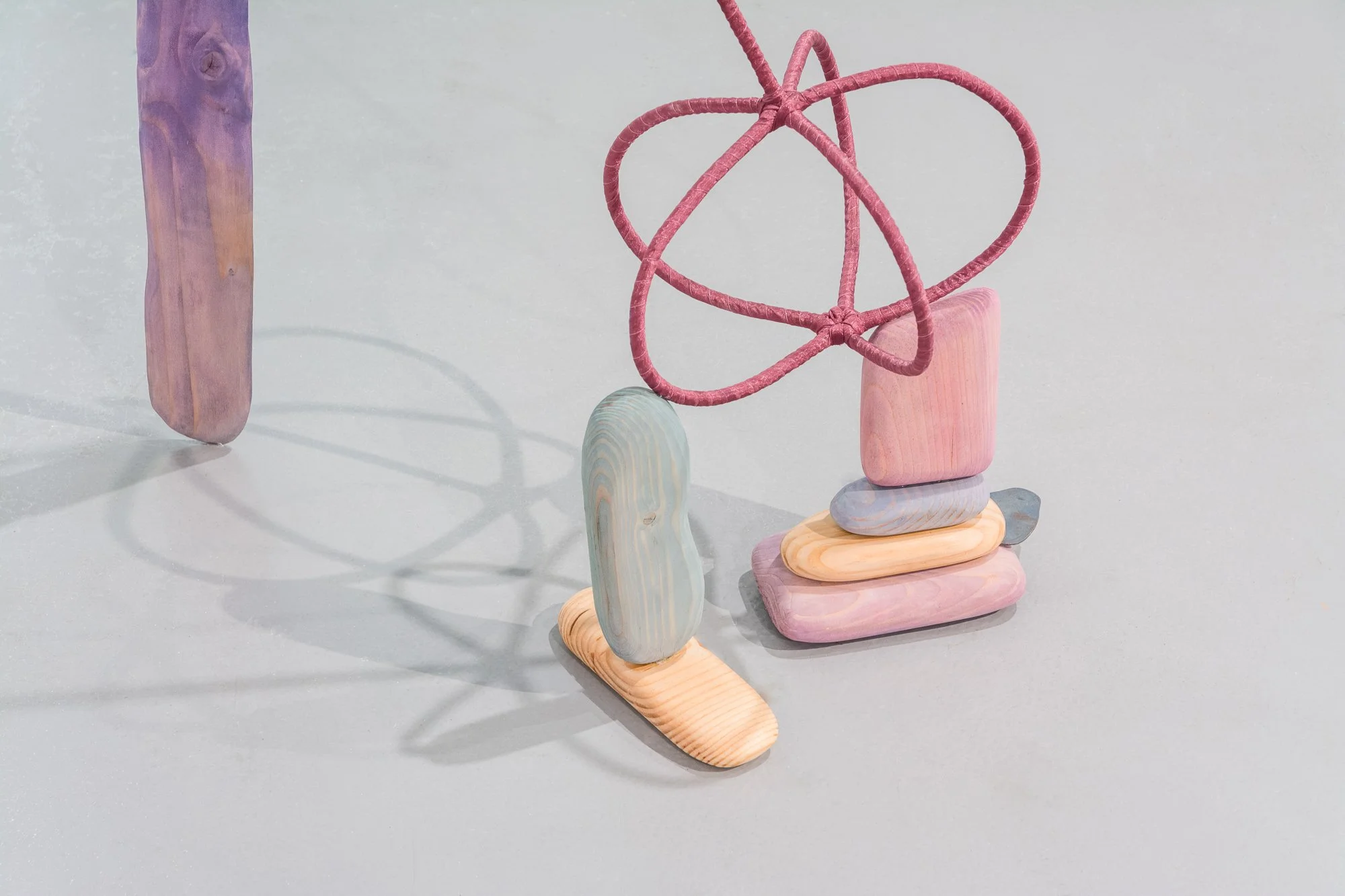 Ribbon-wrapped rebar, sanded scrap wood, knotted ribbon, heat-torched steel scrap, and watercolor paints. 30x12x12 inches